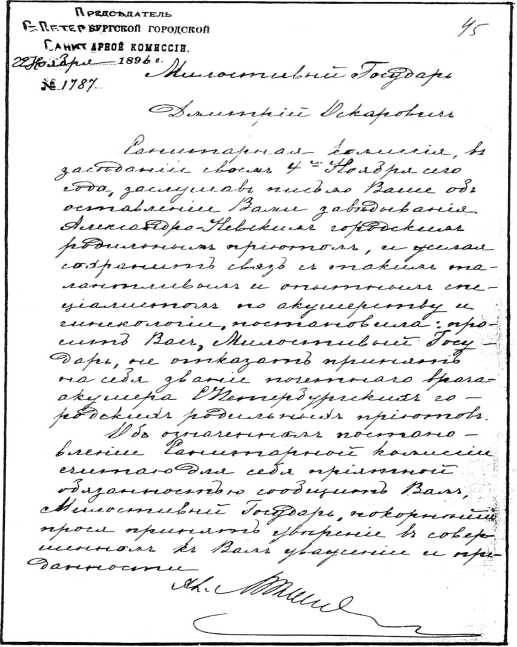 О присвоении Д.О. Отту звания почетного врача— акушера Санкт—Петербургских городских родильных приютов. Уведомление городской Санитарной комиссии от 22 ноября 1896 года по оказанию помощи в наиболее сложных клинических случаях.