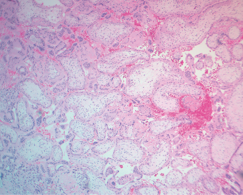 绒毛膜坏死和绒毛膜间隙的纤维素坏死区域被一些作者归结为性传播疾病引起的炎症史 [19,20],有作者认它是血栓性并发症[17],其他作者认为,绒毛的萎缩和炎症性转变,以及纤维素在绒毛间隙的大量沉积,是免疫排斥反应的间接表现[1]。
