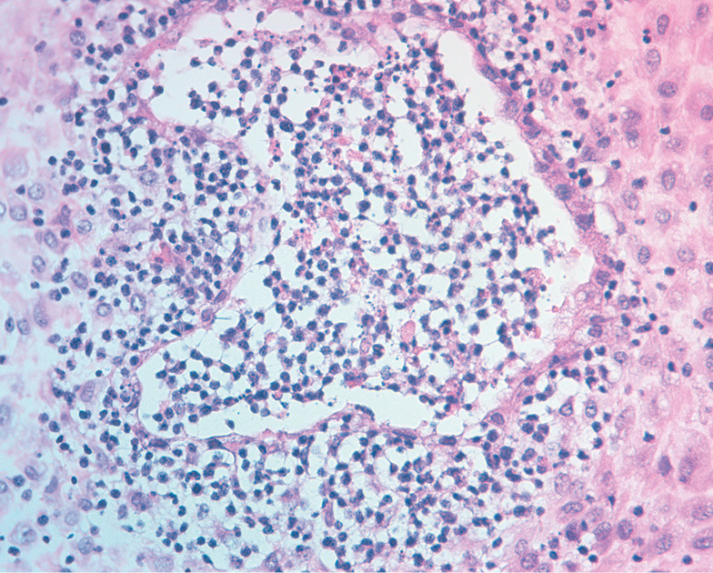图2 染色体绒毛膜异常的蜕膜组织(微脓肿)苏木精-伊红染色,增大×100倍