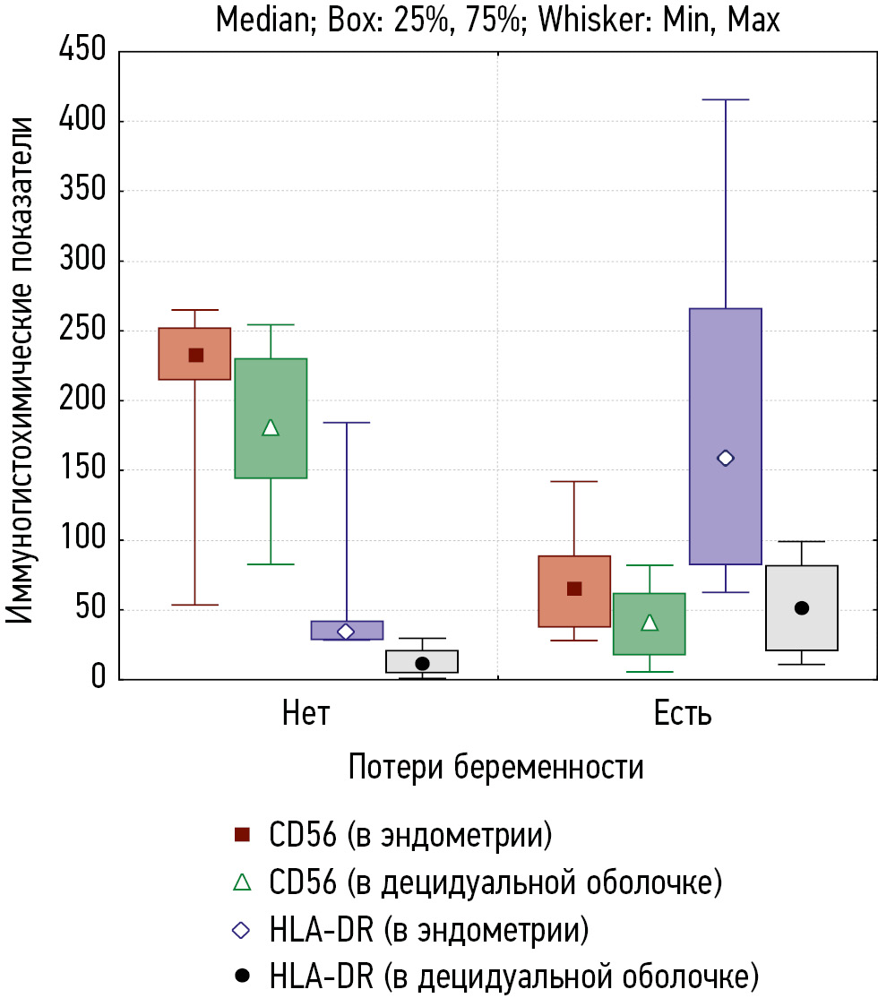 The results analysis of an immunohistochemical study, considering the obstetric anamnesis of patients, revealed a significant relationship between the history of reproductive losses and the level of CD56 and HLA-DR class II.