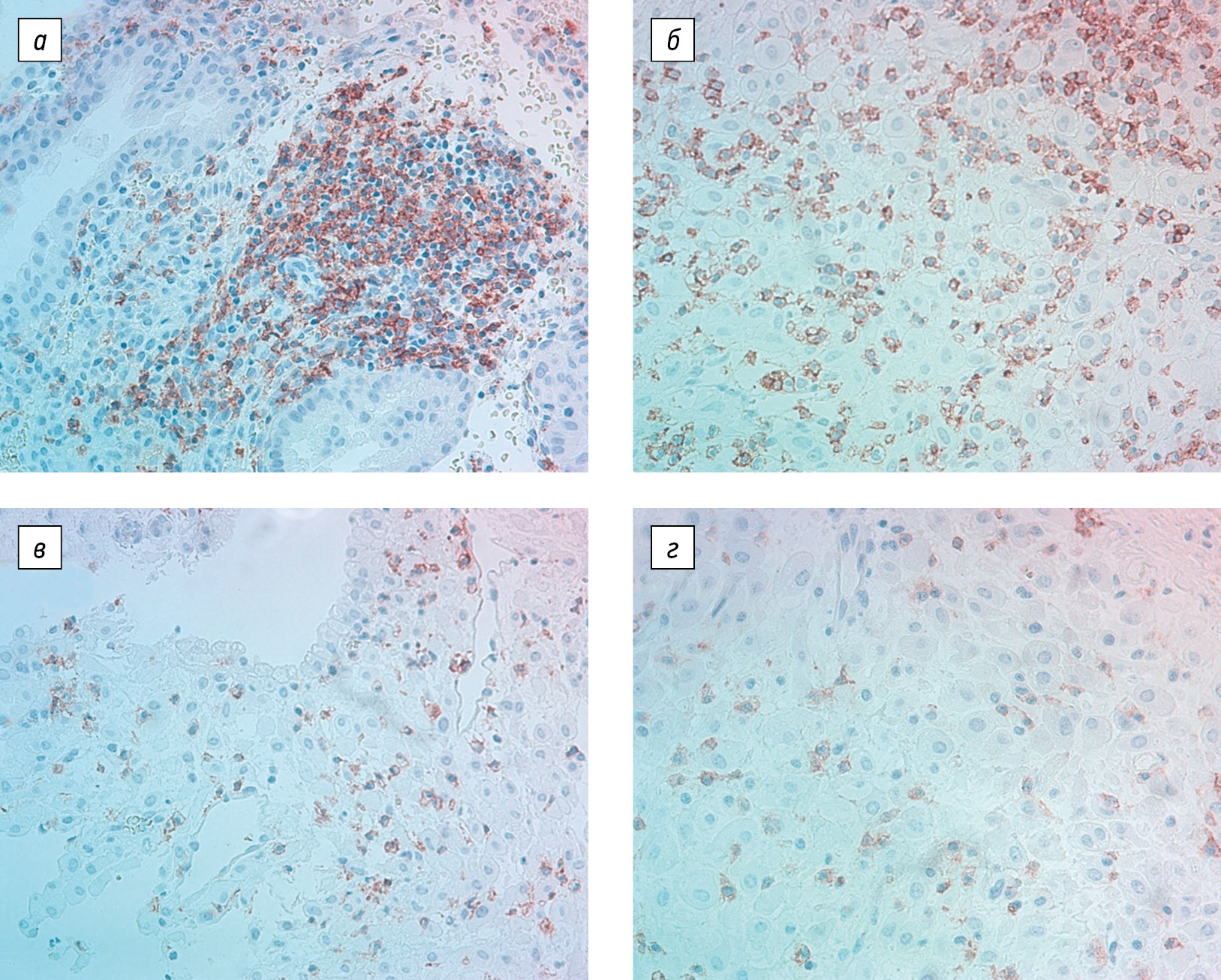 Fig. 6. Micrographs of the immunohistochemical study of HLA-DR class II: a — in the endometrium of a patient with a first missed miscarriage; b — in the decidual tissue of a patient with the first missed miscarriage; c — in the endometrium of a patient with a history of reproductive losses; d — in the decidual tissue of a patient with a history of reproductive losses. The immunohistochemical study was magnified at ×400