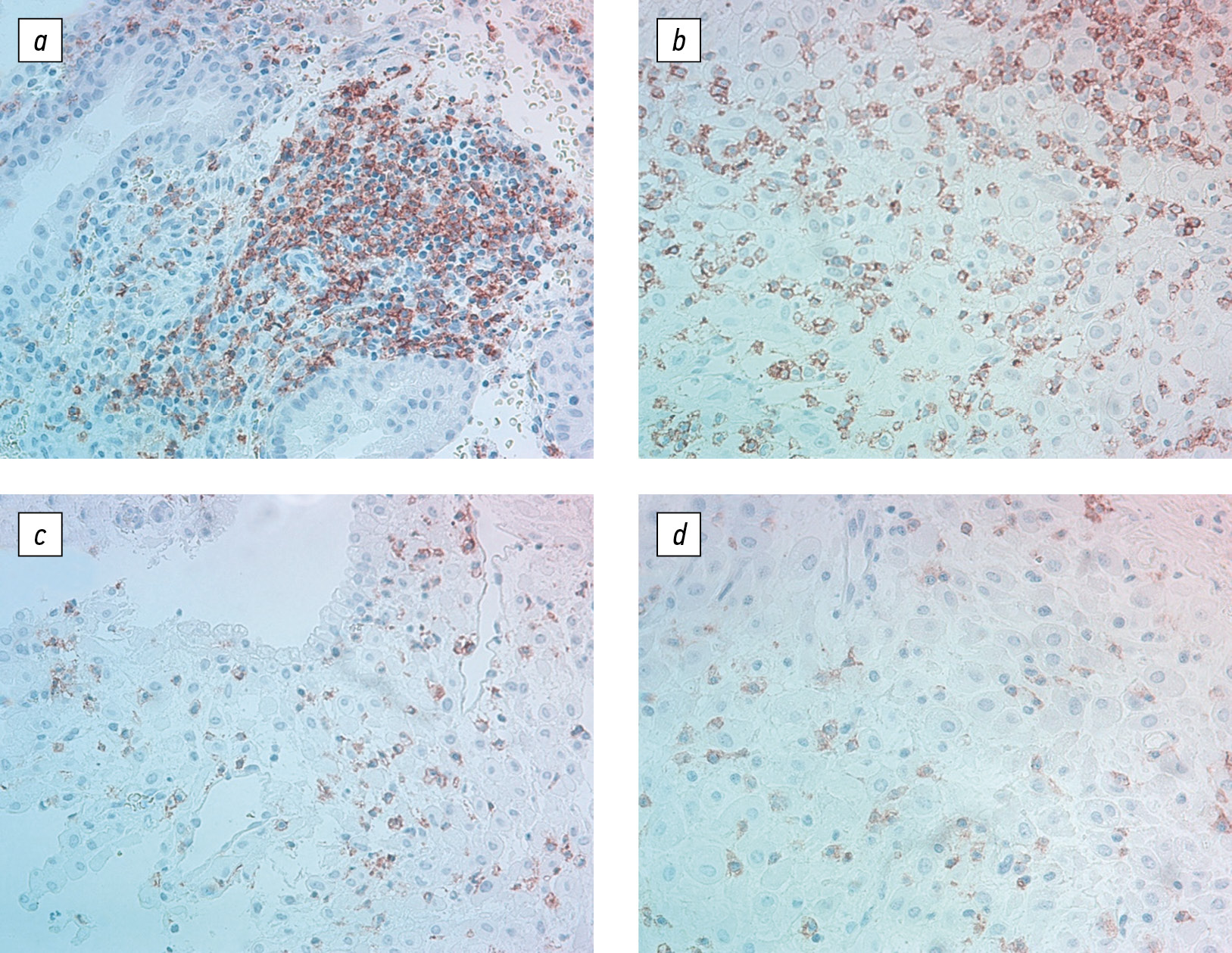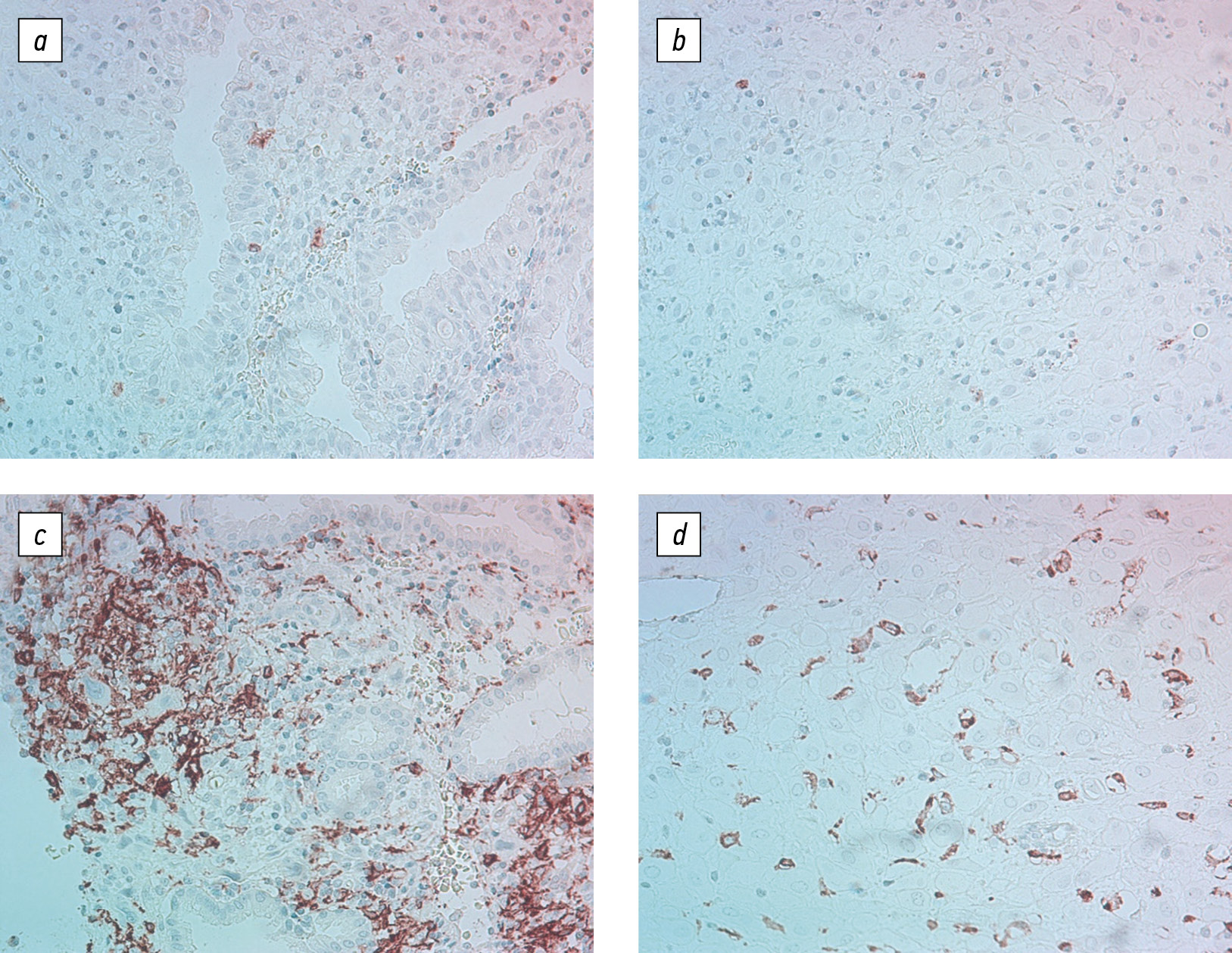 图5 CD56免疫组织化学显微镜照片:a——在初次胎儿停育的病人的子宫内膜中;b——在初次胎儿停育的病人的蜕膜组织中;c——在一个有孕囊排出史病人的子宫内膜中;d——在一个有孕囊排出史病人的蜕膜组织中。免疫组织化学检查,增大×400陪