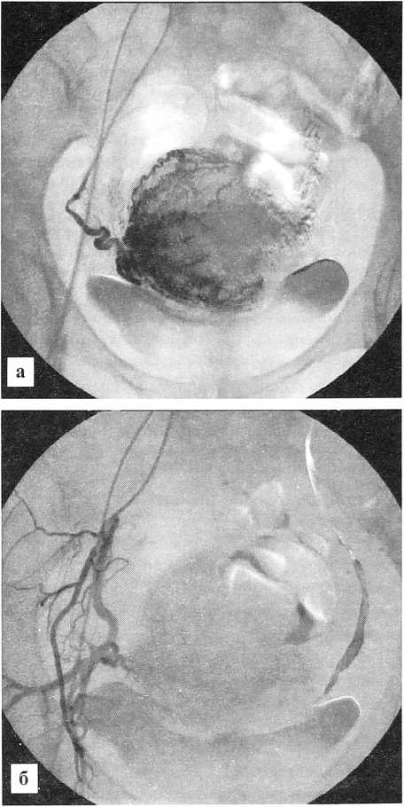 б - после постоянной эмболизации: определяется деваскуляризация патологического очага и стагнация кровотока в основном стволе правой маточной артерии.