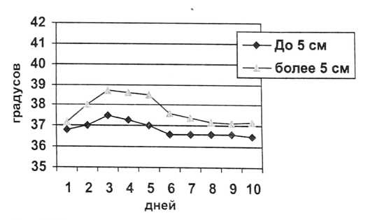 Повышение температуры тела после постоянной эмболизации маточных артерий наблюдалось у всех больных, однако более чем у половины пациенток (58,0±3,9%) наблюдалась в пределах до 37,5°С. Продолжительность и выраженность гипертермии находились в непосредственной зависимости от размеров миоматозного узла (рис. 2).