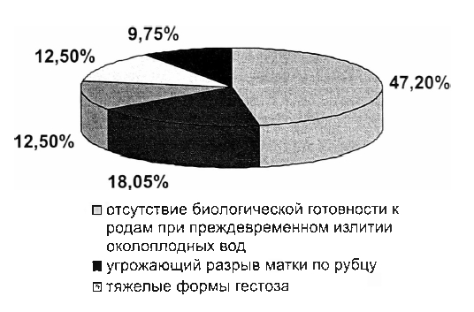 В экстренном порядке оперативное родоразрешение было проведено в 38,7 % случаев. При этом основными показаниями явились (рис. 2):