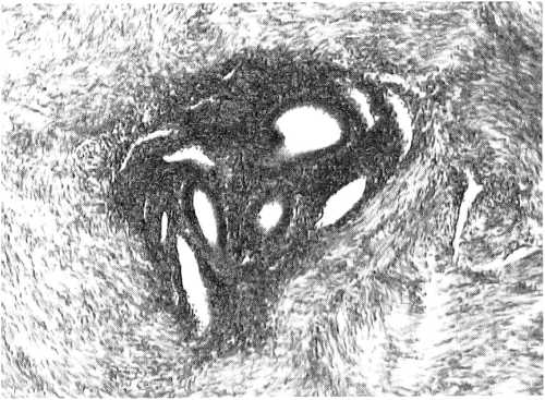 Рис. 1. Эндометриоидные включения в миометрии. Железистый и стромальный компоненты. Микрофотография. ×200, гематоксилин и эозин
