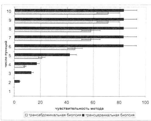 Рис. 2. Зависимость чувствительности мультифокальной трансабдоминальной и трансцервикальной биопсий от количества взятых биоптатов