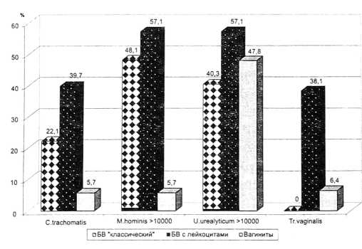 Chlamydia, Mycoplasma, Ureaplasma and Trichomonas were found significantly more often in women with BV that in those without (4,3; 15,2; 2,6; 5,9 times accordingly). Chlamydia and Ureaplasma in diagnostic levels were identified more often in the patients with BV and leukocytes than in those with the «classical» variant (1,8 and 1,4 times accordingly). Trichomonas was found only in the patients with BV and leukocytes; and M.himinis in diagnostic levels was identified in both variants equally.