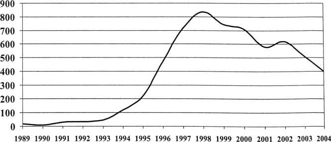 Абсолютное число случаев врожденного сифилиса, зарегистрированных в России в период с 1989 по 2004 годы