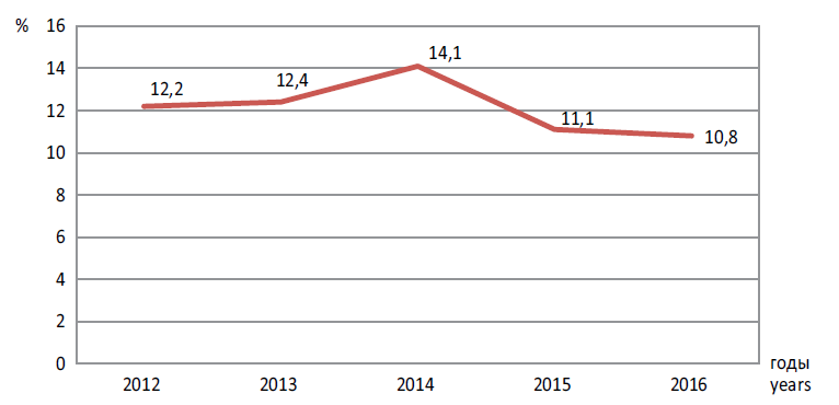 Средние значения частоты критических кровотечений в 20 исследованных учреждениях составили в 2012 г. — 12,2 %, в 2013 г. — 12,4 %, в 2014 г. — 14,1 %, в 2015 г. — 11,1 %, в 2016 г. — 10,8 % (рис. 1).