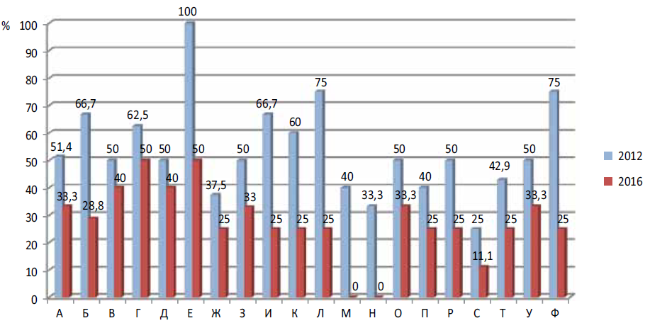 Рис. 2. Частота критических кровотечений, произошедших в исследованных учреждениях в 2012 и 2016 гг.