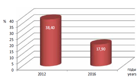 Установлено достоверное (р < 0,01) снижение частоты критических гипотонических кровотечений в 2016 г. (20 случаев — 17,9 ± 3,6 %) по сравнению с соответствующим показателем в 2012 г. (51 случай — 38,4 ± 4,3 %) (рис. 3). Частота критических гипотонических послеродовых кровотечений является наиболее достоверным показателем качества помощи матерям в стационарах, так как позволяет косвенно судить об организации работы, о знании национальных стандартов и командном подходе при оказании помощи пациенткам. Наблюдение в послеродовом периоде за родильницей по стандартам, оказание неотложной акушерской помощи с началом кровотечения, включающей инфузионную терапию, быструю оценку и диагностику причины кровотечения, исполь зование методов временной остановки кровотечения, правильную последовательность использования утеротонических препаратов, снижают частоту критических послеродовых гипотонических кровотечений.