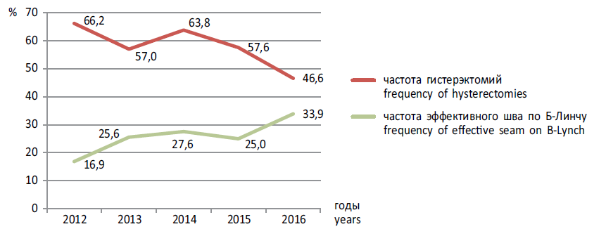 Рис. 4. Динамика изменения частоты гистерэктомий и эффективного шва по Б-Линчу у пациенток с критическими гипотоническими кровотечениями