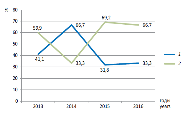 В 2016 г. в учреждениях, успешно использующих АКС, удельный вес числа женщин, умерших от кровотечений, был в 2 раза меньше (33,3 %), чем в учреждениях, не использующих АКС (66,7 %) (рис. 5).
