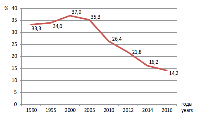 Динамика материнской смертности от акушерских кровотечений в Таджикистане представлена на рисунке 6. Как видно из приведенных данных, в целом по стране отмечается снижение удельного веса кровотечений в структуре причин материнской смертности. В период с 1990 по 2005 г. каждая третья женщина умирала от акушерских кровотечений во время беременности, в родах и в послеродовом периоде. В 2010 г. в стране были внедрены национальные стандарты по ведению пациенток с акушерскими кровотечениями.
