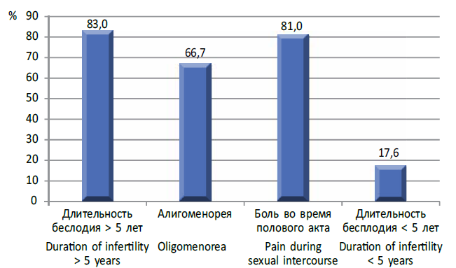 Среди пациенток с реактивной тревожностью длительность бесплодия более 5 лет отмечена у 40 (83 %), меньше 5 лет — у 8 (17 %), альгоменорея — у 32 (66,7 %), боль во время полового акта — у 39 (81 %) женщин (рис. 2). Реактивная тревожность пациенток с длительностью бесплодия более 5 лет (34–85 % женщин) была умеренной и высокой. Только у 6 (15 %) женщин с длительным бесплодием диагностирована легкая степень реактивной тревожности. Эти данные подтверждают, что определяющее значение в степени изменения психоэмоционального статуса женщин с эндо метриозом имеет длительность бесплодия. Более половины женщин с длительным бесплодием отметили неэффективность предыдущих обращений к врачам.