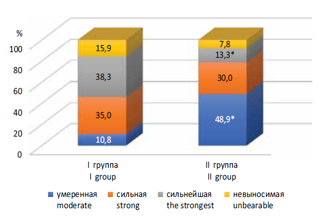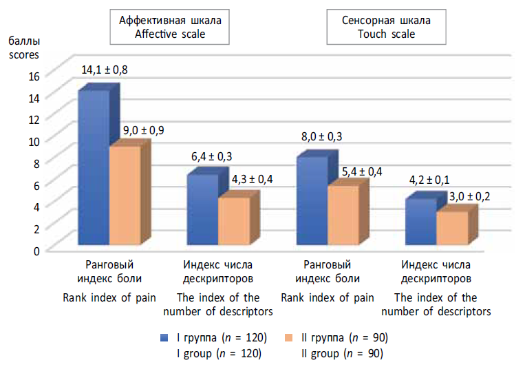Интенсивность ощущений боли по эвалюативной шкале опросника ранжирована от «слабой» (1 балл) до «невыносимой» (5 баллов). Поскольку по данной шкале можно выбрать лишь одно слово, индекс числа дескрипторов у всех был одинаковым и равнялся единице. Среднее значение рангового индекса боли в основ ной группе превышало аналогичный показатель в группе сравнения (3,5 ± 0,1 и 2,8 ± 0,1; p < 0,001).