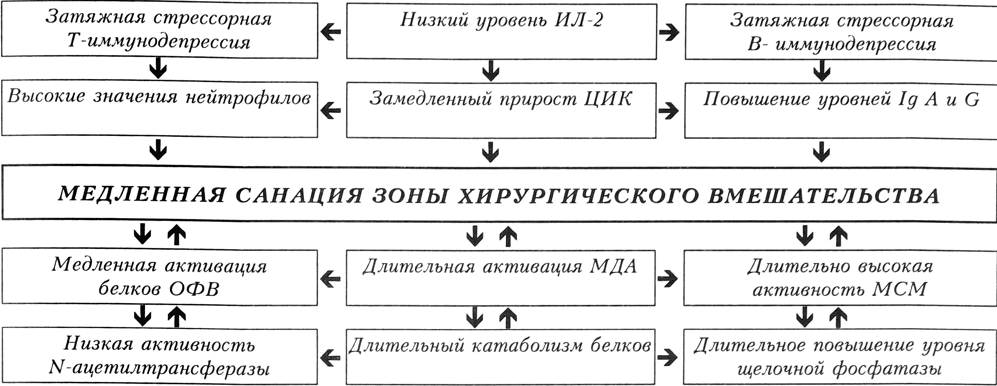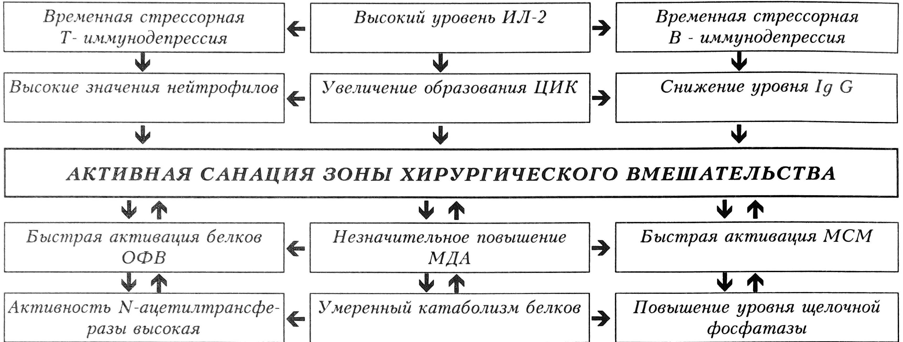 Известно, что элиминация аутоантигенного субстрата, образующегося в результате хирургического вмешательства, происходит иммунным путем (аутосанация как саногенетический фактор). Это указывает на исключительную важность иммунных и биохимических аспектов саногенетичесих адаптационных реакций. При этом к первичным пусковым факторам, на наш взгляд, следует отнести первично- и необратимо поврежденные ткани, подвергающиеся аутолизу в результате дегенерации и набухания, выделяющие гистотоксические вещества, которые, в свою очередь, обладают патогенными свойствами различной выраженности. К ним также относятся продукты распада крови, излившейся во время операции и являющейся прекрасной питательной средой для инфекции, микроорганизмы, попавшие в рану как экзо-, так и эндогенным путем. Перечисленные повреждающие факторы являются по природе чуждыми внутренней среде организма, т. к. обладают антигенными свойствами. Они реализуются в зоне повреждения в виде реакций местного кровообращения (спазм, стаз крови и тромбоз поврежденных сосудов). Затем формируется зона локального отека операции, обеспечивающая беспрепятственную инфильтрацию (отграничение) зоны повреждения иммуннонекомпетентными клетками (макрофаги, лимфоциты) и доставку иммуноглобулинов как естественных антител непосредственно к месту локализации образующихся аутоантигенов. Далее следует генерация нейроэндокринного стимула системной адаптивной реакции, в частности системного иммунного и биохимического ответа, направленного на удаление аутоантигенного материала из организма.