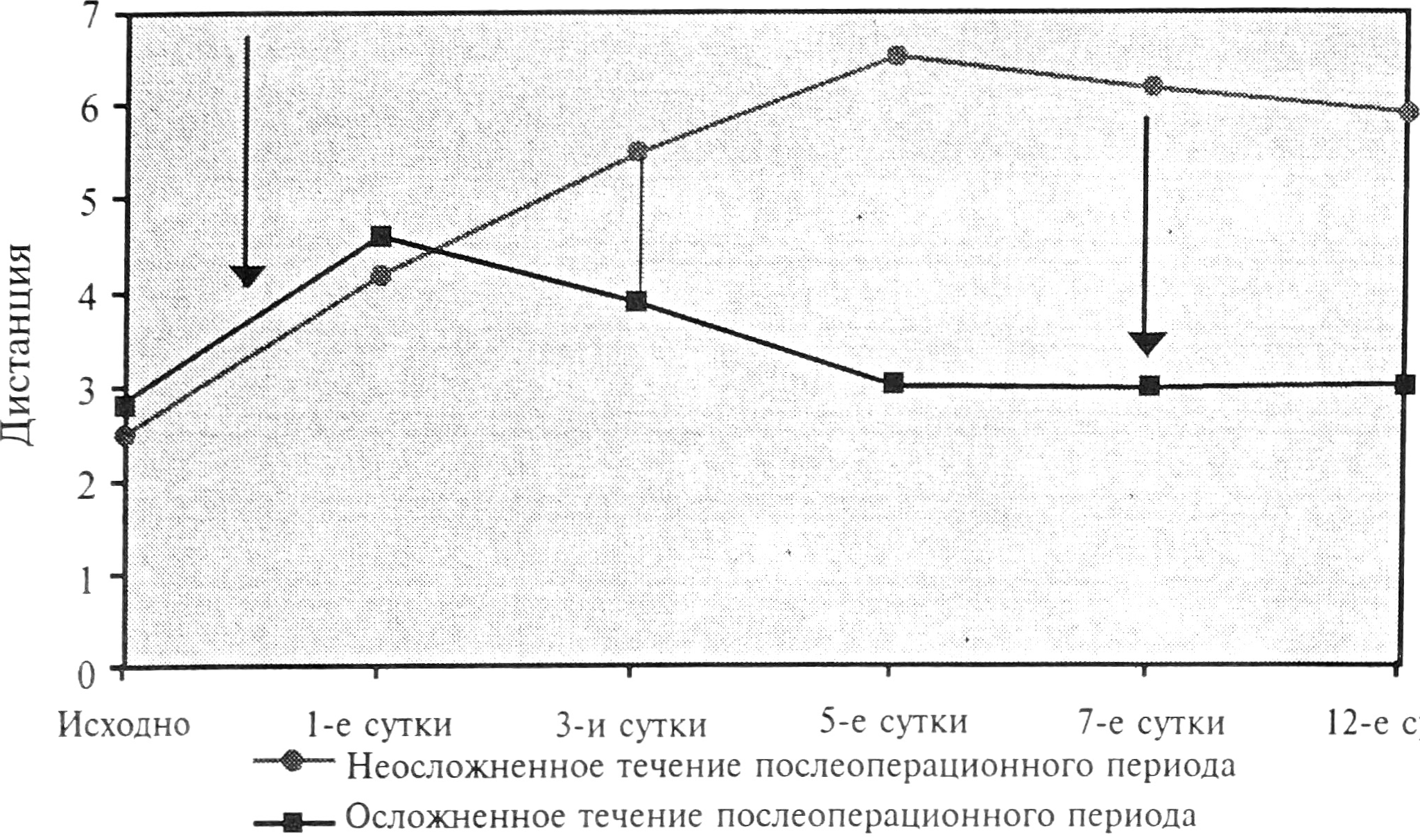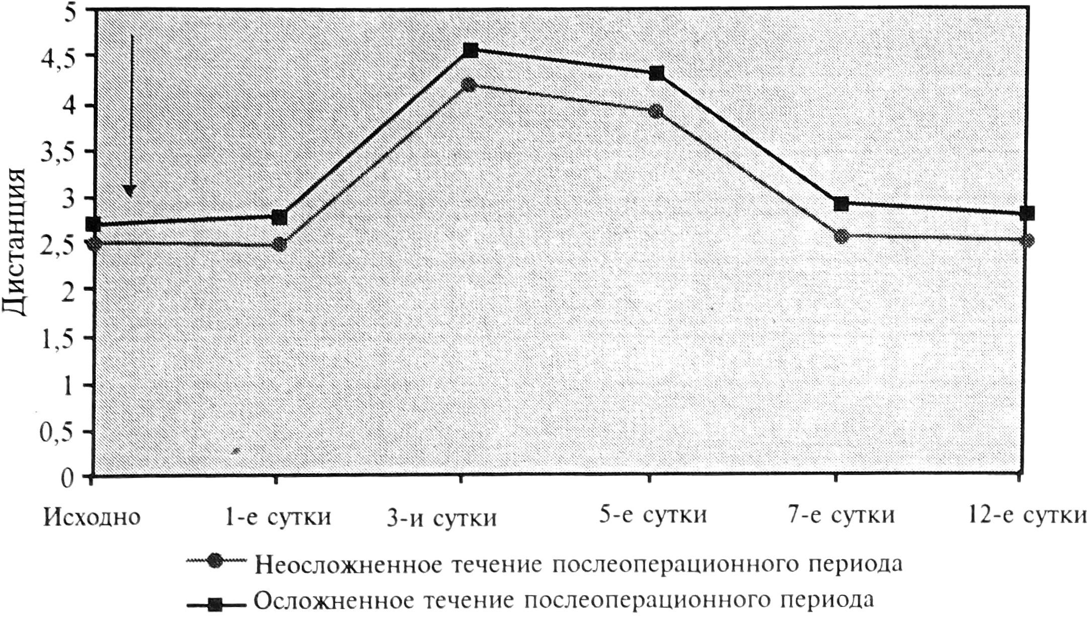Рис. 3. Характер неосложненного течения послеоперационного периода у больной А (стрелкой отмечен момент операции).