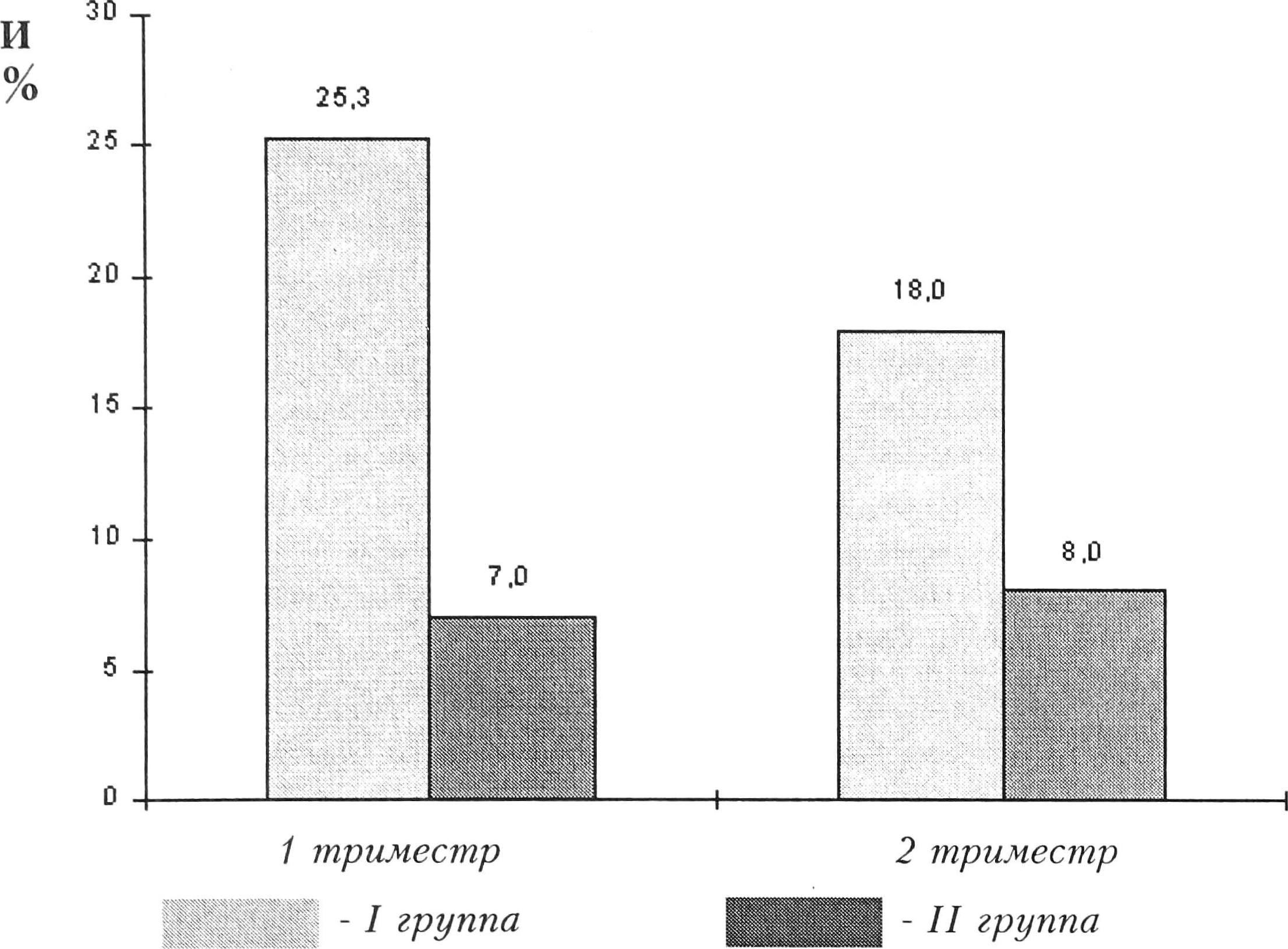 Также обращает на себя внимание, что частота угрожающего выкидыша во втором триместре беременности значительно была выше у женщин I группы по сравнению со II группой - 15 (18.1±4.2%) и соответственно 6 (8.4±3.3%) (р<0.05). Эти данные представлены на рисунке и в табл. 1.