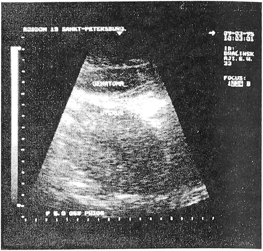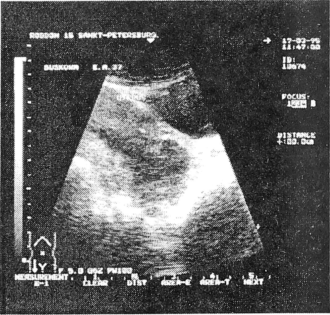 В одном случае течение послеоперационного периода осложнилось гематомой передней брюшной стенки. На эхограмме гематома определяется как анэхогенное образование с четким контуром. Уточнение ее размеров и локализации на 2-е сутки после операции позволило рационально вести послеоперационный период с максимальным эффектом при опорожнении гематомы (рис. 3).