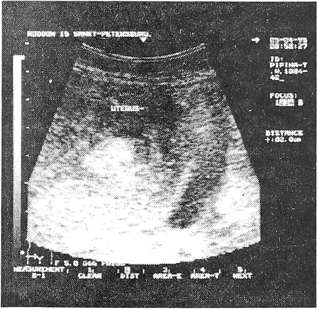 Рис. 5. Гематометра в послеоперационном периоде. Содержимое полости матки сместилось в шейку.