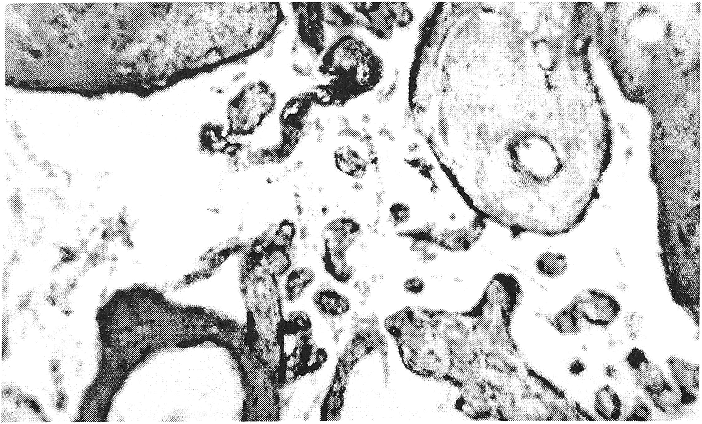 Указанные изменения сопровождались определенными компенсаторно-приспособительными процессами. В частности, удельный вес терминальных и специализированных ворсин во всех случаях исследований был одинаковым и составил 72%, из них в 59,1 % случаев удельный вес ворсин был высоким. Количество функционирующих синцитиальных узлов низкое -27,3%. В 54,5% случаев отмечалось очаговое сгущение ворсин, наряду с наличием значительного количества ворсин с большим числом центрально расположенных сосудов (40,9%) и ворсин с выраженными явлениями ангиоматоза (68,1%). Следует отметить, что многие ворсины в очагах сгущения были бессосудистыми или со слабовыраженными спавшимися капиллярами.