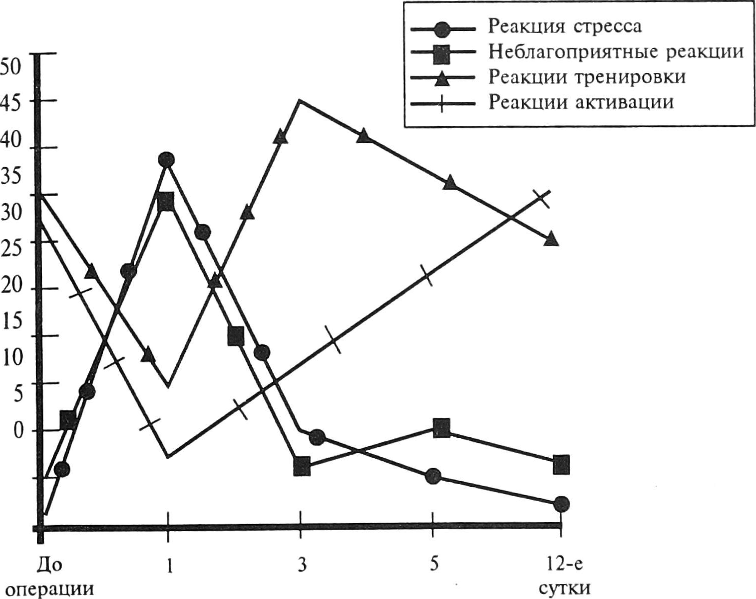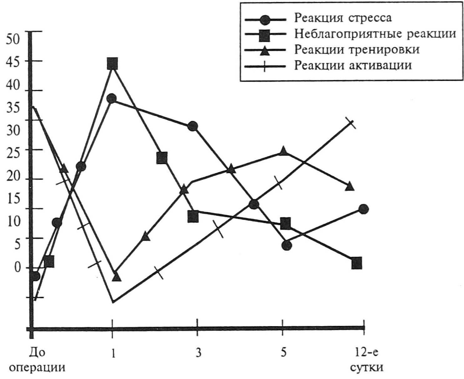 На 1-е сутки после операции у больных 1-й группы наблюдалось преобладание реакций стресса (45,3%) и неблагоприятных реакций (33,3%). На 3-й и 5-е сутки послеоперационного периода у этих же больных отмечался подъем реакций тренировки (45,6% и 38,6% соответственно) и активации (19,1% и 31,1 %).