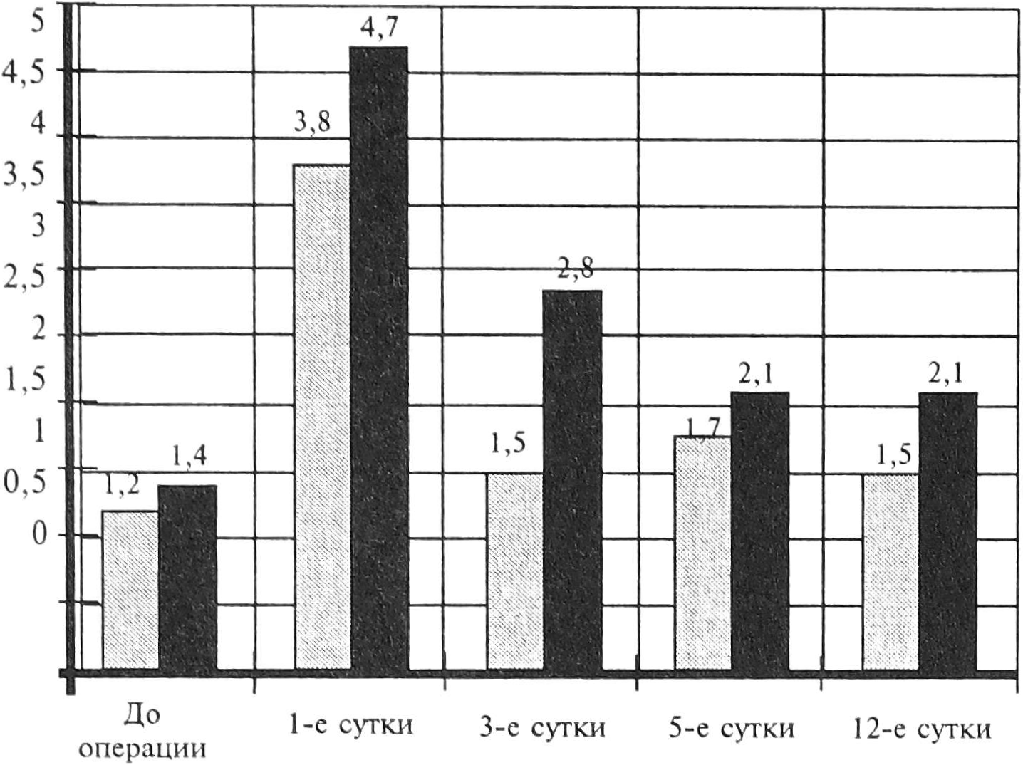 На 1-е сутки после операции ЛИИ у женщин обеих групп существенно повышался по отношению к исходному уровню до операции (в 3,2 раза). Далее до 12-х суток у пациенток с ПГВО значения ЛИИ были достоверно (р< 0,01 ) выше по отношению к таковым у женщин с неосложненным течением послеоперационного периода. Следует отметить, что только у женщин с неосложненным течением послеоперационного периода наибольшие повышения ЛИИ (на Ге и 5-е сутки после операции) соответствовали подъемам количества неблагоприятных реакций. У женщин с ПГВО такой закономерности не наблюдалось. Начиная с 5-х суток после операции значения ЛИИ у них не изменились.