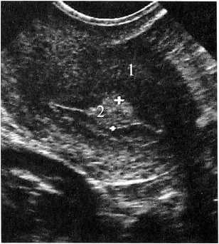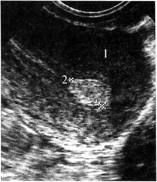 ЛУГ в эндометрии в дне полости матки. Продольное ТВ-сканирование. 1 — матка, 2 — М-эхо с ЛУГ (УЗ картина напоминает одиночный полип эндометрия)