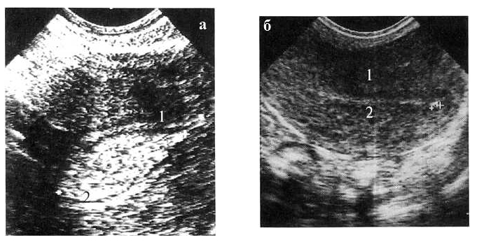 Эндометрий соответствует пролиферативной фазе, без влияния секреторной фазы. Продольное ТВ-сканирование: 1 — матка, 2 — М-эхо без ЛУГ; а) — до введения окситоцина; б) — после введения окситоцина образования при ДН, отсутствие изменения формы и размера при ФФДП.