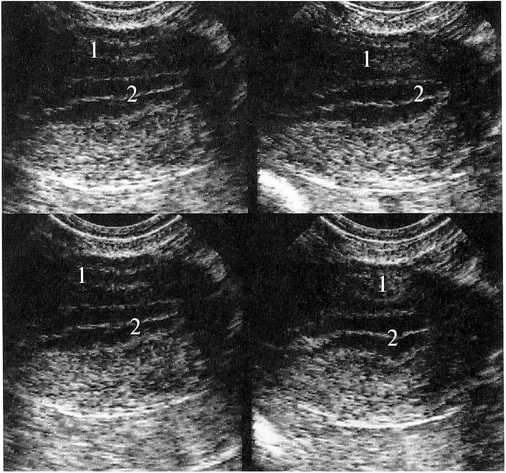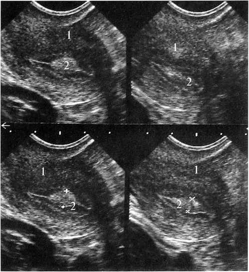 Два «замороженных» изображения матки до введения окситоцина. ЛУГ в эндометрии в середине полости матки. Продольное ТВ-сканирование: 1 — матка, 2 — М-эхо с ЛУГ
