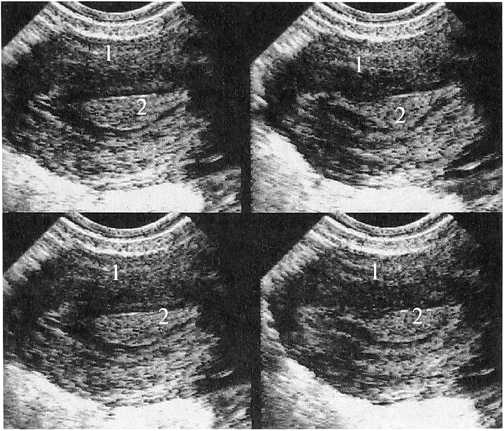 Два изображения матки после начала действия окситоцина. Изменение формы ЛУГ в эндометрии при сокращении стенок матки. Продольное ТВ-сканирование: 1 — матка, 2 - М-эхо с ЛУГ