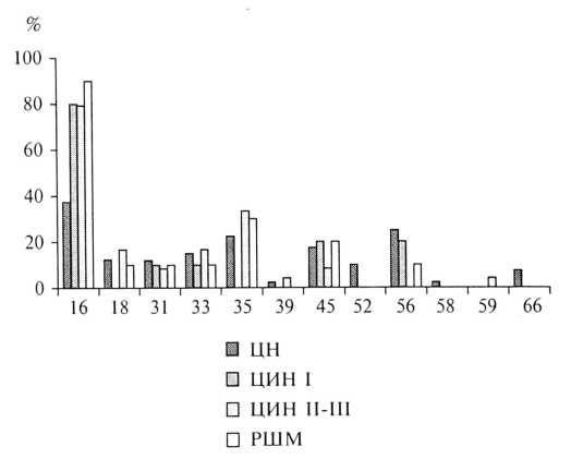 Рис. 1. Частота встречаемости типов ВПЧ высокого онкогенного риска в группах с различными данными цитологических исследований