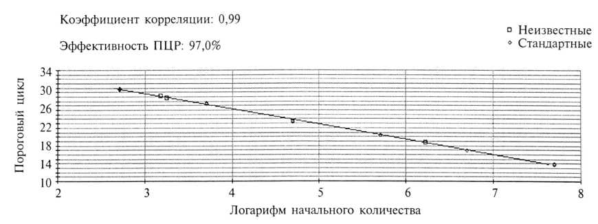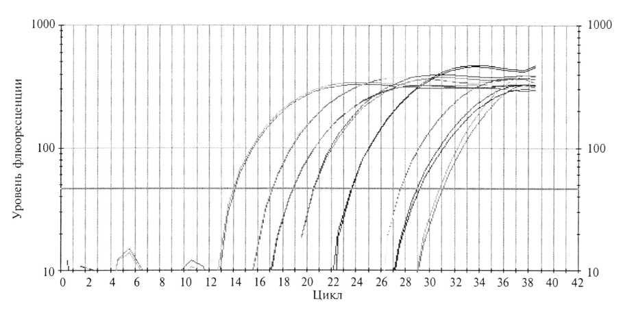 Увеличение флюоресценции, отражающее динамику накопления продуктов амплификации, отображается на дисплее прибора в конце каждого цикла. ПЦР в реальном времени позволяет точно определить количество копий исследуемой ДНК в клинической пробе, так как исходное количество исследуемой матрицы оценивается по началу логарифмической фазы реакции, а не по количеству продуктов амплификации в конце реакции. На рис. 2 представлен график амплификации фрагмента гена Е2 ВПЧ 16 типа в серии 10-кратных разведений стандарта (5x107—5x102) и двух пробах ДНК, выделенной из клинического материала. Концентрацию ДНК в исследуемых пробах определяли с помощью стандартной кривой (рис. 3).