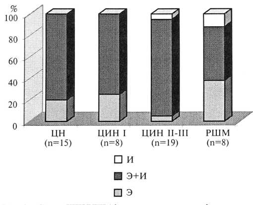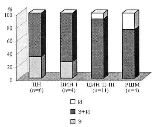 Результаты определения статуса ДНК ВПЧ 16 типа в клинических пробах представлены на рис. 4. У женщин без атипии эписомную форму ДНК вируса типа выявили в 3-х случаях из 15-ти, смешанную — в 12-ти. В случаях легкой дисплазии эписомная форма ДНК была обнаружена в 2-х пробах из 8-ми, смешанная — в 6-ти. В пробах, полученных от женщин без атипии и с ЦИН I, интегрированная форма вируса не встречалась. При умеренной и тяжелой дисплазии эписомная форма ВПЧ была обнаружена в одном случае из 19-ти, смешанная — в 17-ти, и в одной пробе была выявлена интегрированная форма ДНК. У женщин с РШМ эписомная форма вируса была выявлена в 3-х случаях из 10-ти, смешанная — в 4-х, интегрированная — в одном.