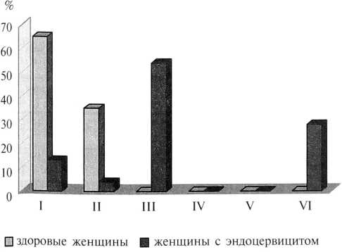 При оценке микробиоценоза влагалища у наблюдаемых нами женщин обнаружено, что I (физиологическая) картина имела место у 12,86±4,0% женщин с эндоцервицитом и у 65±10,94% здоровых женщин (р< 0,05). Картина II микробиоценоза влагалища достоверно чаще встречалась в группе здоровых женщин (35±10,94%) по сравнению с больными эндоцервицитом (4,28±2,42%, р < 0,05). Картины микробиоценоза вагины, характерные для бактериального и кандидозного вагинита (III и VI), встречались только в первой группе женщин и составили 54,28±5,95% и 28,58±5,39% соответственно. Что касается IV и V картин, соответствующих гонорейному и трихомонад- ному поражению урогениталий, то они не встречались ни у одной из наблюдаемых нами женщин (рис. 1).