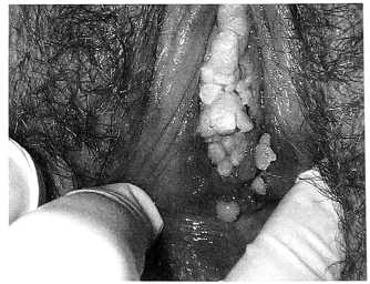 Эти разрастания имеют вид выступающих бархатистых «белых полей«. Во втором случае (рис. 5) — множественные кондиломы в виде «бородавок», закрывающие вход во влагалище.