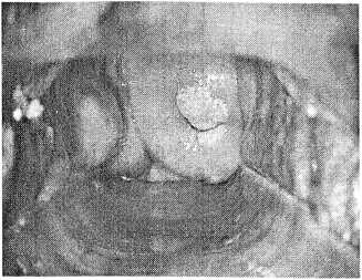 На слизистой шейки матки кондиломы и папиллообразные образования при кольпоскопии встречаются редко (рис. 10). На рисунке виден обширный белый, возвышающийся, плотный участок разрастания на передней губе шейки матки возле наружного зева.