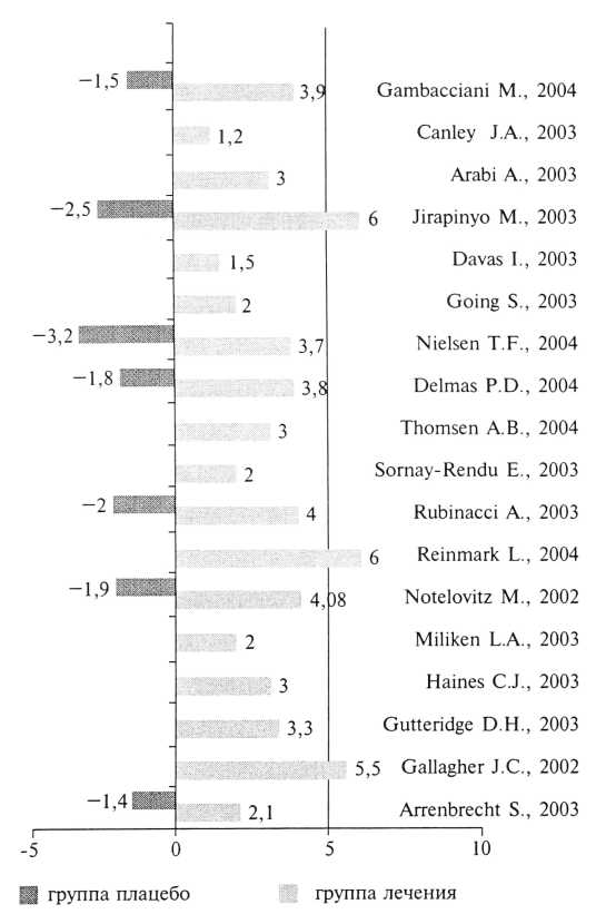 Рис. 2. Динамика МПКТ (% DEXA за 12 мес) в бедре при применении ЗГТ по данным рандомизированных исследований