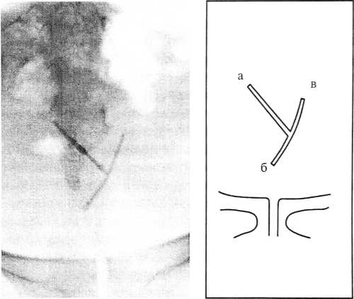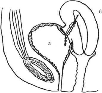 в — другое плечо, располагавшееся в стенке мочевого пузыря