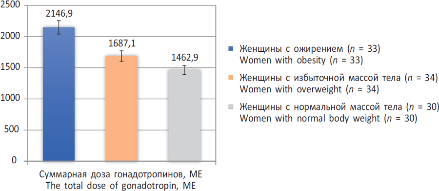 При оценке длительности стимуляции были получены следующие данные: с увеличением индекса массы тела у женщины увеличивалась длительность стимуляции суперовуляции. При попарном сравнении у женщин с ожирением отмечалось увеличение длительности стимуляции суперовуляции в 1,1 раза по сравнению с группой контроля и в 1,07 раза по сравнению с женщинами с избыточной массой тела (p < 0,0001).