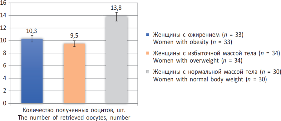 При попарном сравнении групп между собой были выявлены статистически значимые различия между количеством полученных ооци тов у женщин из разных групп сравнения (p < 0,01). У женщин, страдающих ожирением, количество полученных ооцитов было в 1,5 раза меньше, чем у женщин с нормальным весом, и в 1,1 раза меньше, чем у женщин с избыточным весом (рис. 2).