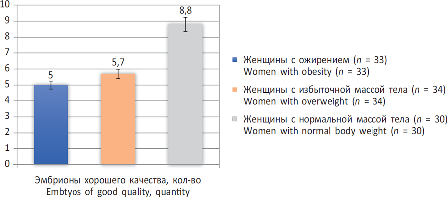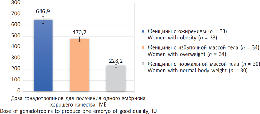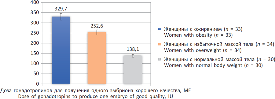 Результаты и обсуждение. Эффективность программ вспомогательных репродуктивных технологий (ВРТ) достоверно снижается у женщин I группы вследствие более слабого ответа яичников на стимуляцию суперовуляции: повышается потребность в препаратах гонадотропинов для стимуляции овуляции (р < 0,0001), увеличивается продолжительность стимуляции суперовуляции (р < 0,0001). Количество эмбрионов хорошего качества достоверно ниже у женщин с ожирением, чем у женщин с нормальной массой тела и избыточной массой тела (р < 0,0001). Частота наступления клинической беременности у женщин с нормальной массой тела была достоверно выше, чем у женщин с избыточным массой тела/ожирением (р < 0,05).
