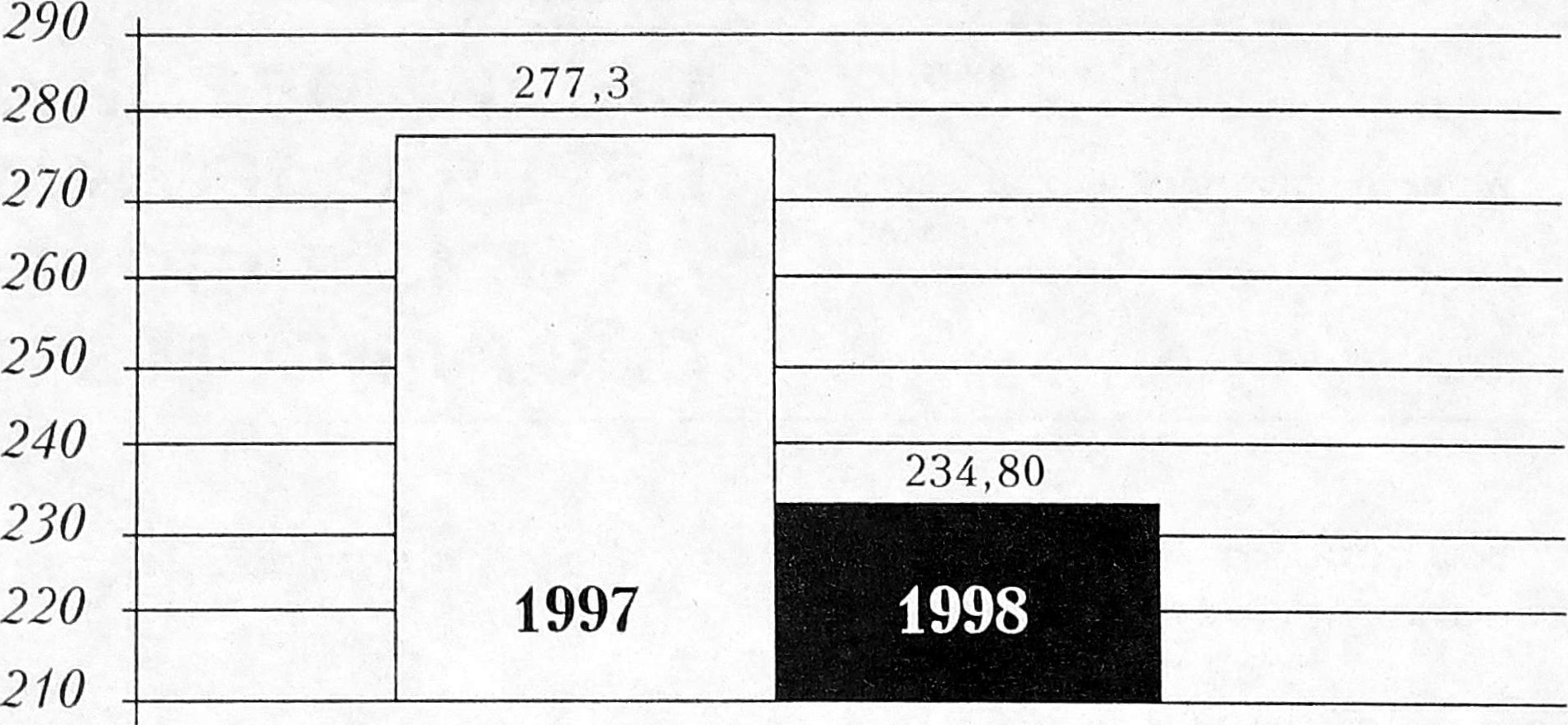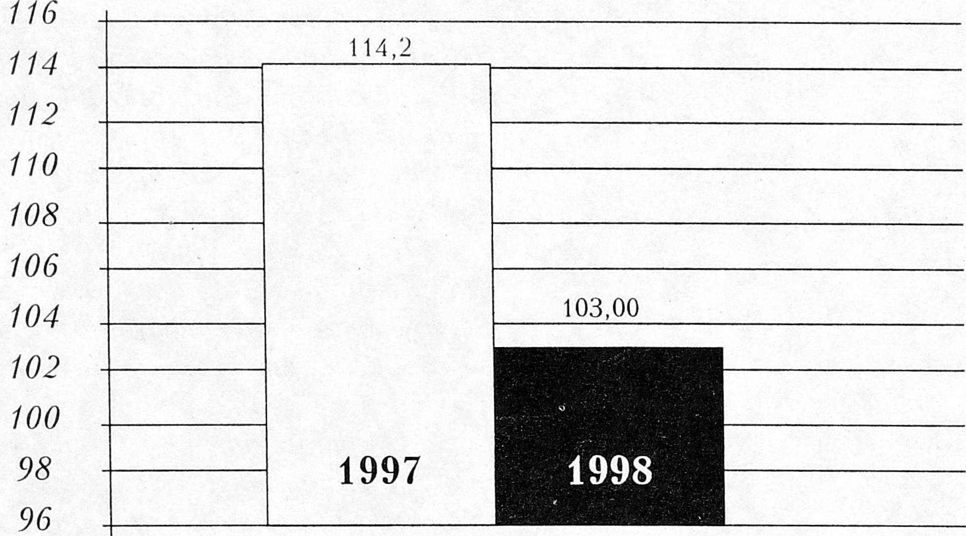 Рис. 2. Динамика заболеваемости гонореей в РФ в 1997-1998 гг. (данные МЗ РФ на 100 тыс. населения).