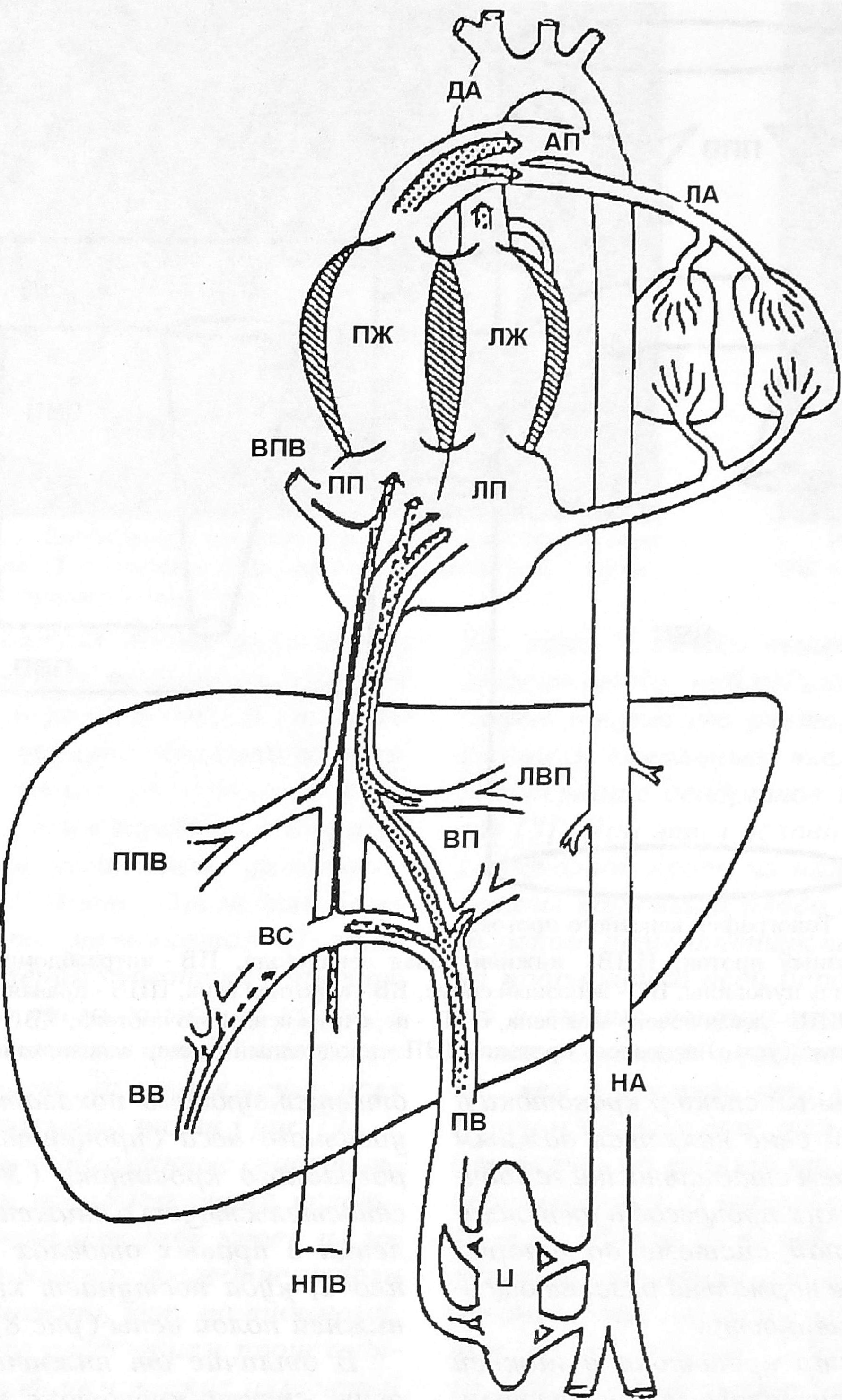 Рис. 1. Схематическое изображение циркуляции крови в фетоплацентарной системе (по Creasy R.K., Resnik R., 1989). ПВ - пупочная вена, ВП - венозный проток, НПВ - нижняя полая вена, ВПВ - верхняя полая вена, ППВ - правая печеночная вена, ЛПВ - левая печеночная вена, ВВ - воротная вена, ВС - воротной синус, ПП - правое предсердие, ПЖ - правый желудочек, ЛП - левое предсердие, ЛЖ - левый желудочек, ДА - дуга аорты, НА - нисходящий отдел аорты, АП - артериальный проток, ЛА -легочная артерия, П - плацента.
