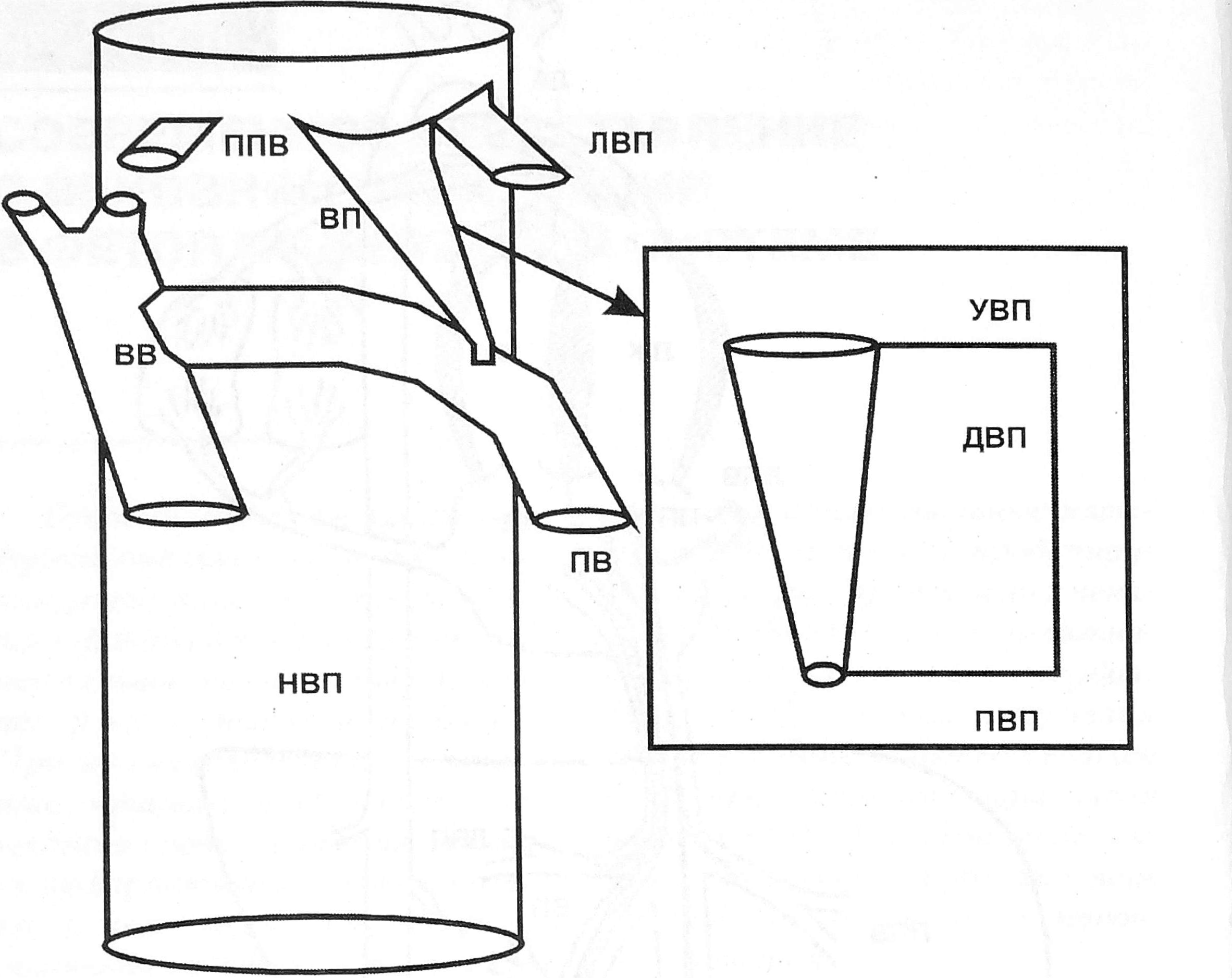 Рис. 2. Топография венозного протока. ВП - венозный проток, НПВ - нижняя полая вена плода, ПВ - интраабдомииальный участок вены пуповины, ВС - венозный синус, ВВ - воротная вена, ППВ - правая печеночная вена, ЛПВ - левая печеночная вена, ПВП - перешеек венозного протока, УВП - выходное отверстие (устье) венозного протока, ДВП - продольный размер венозного протока.