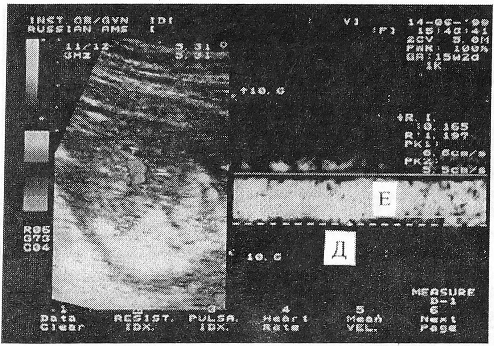 Рис. 3. Допплерограмма пульсирующего кровотока в вене. Д — максимальная скорость кровотока, Е - минимальная скорость кровотока.