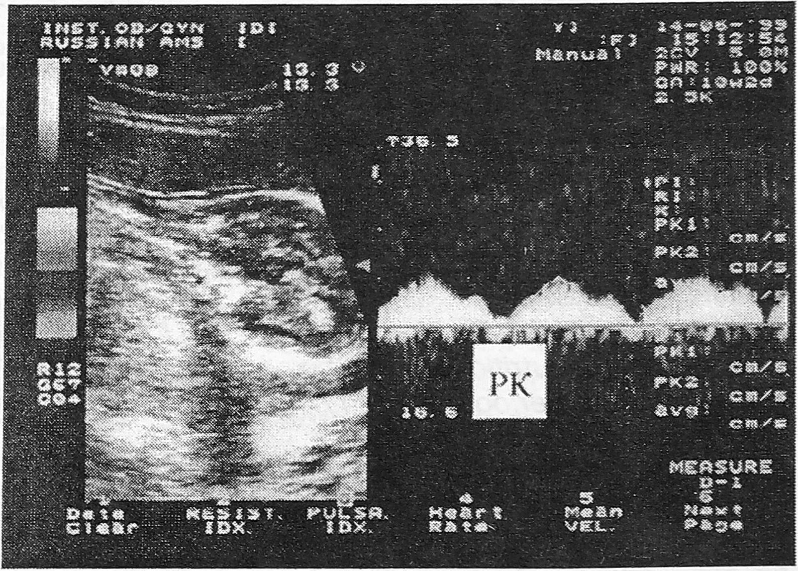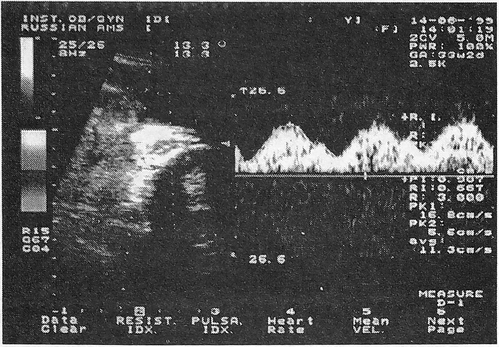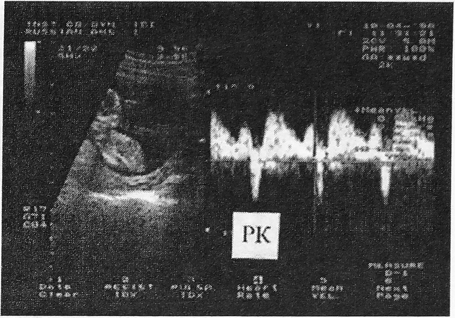 Рис. 6. Допплерограмма кровотока в яремной вене у плода при сроке беременности 24 недели. РК - ретроградный кровоток.