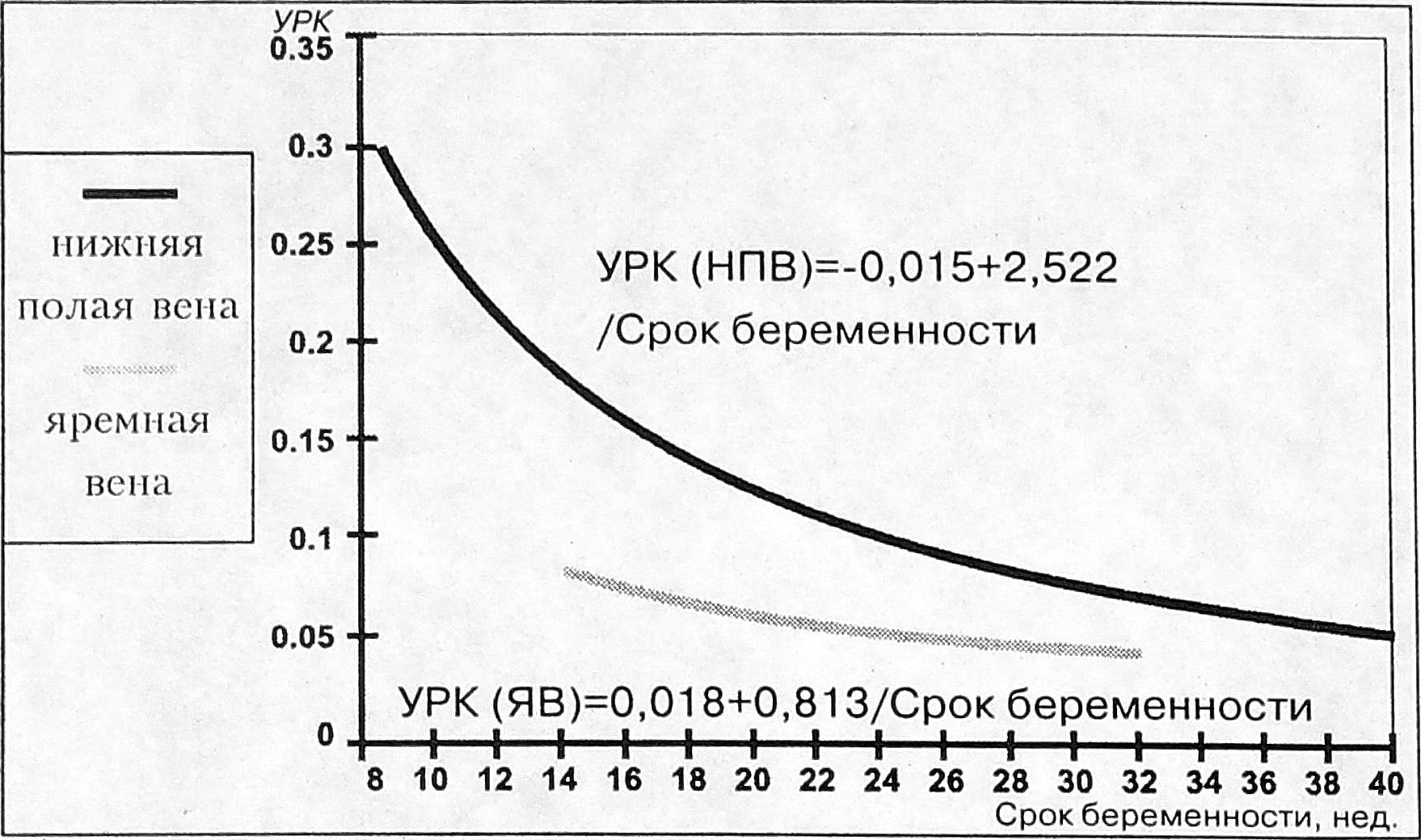 Рис. 8. Динамика изменения удельного веса ретроградного кровотока (УРК) в нижней полой (НПВ) я яремной (ЯВ) венах плода в течение беременности.